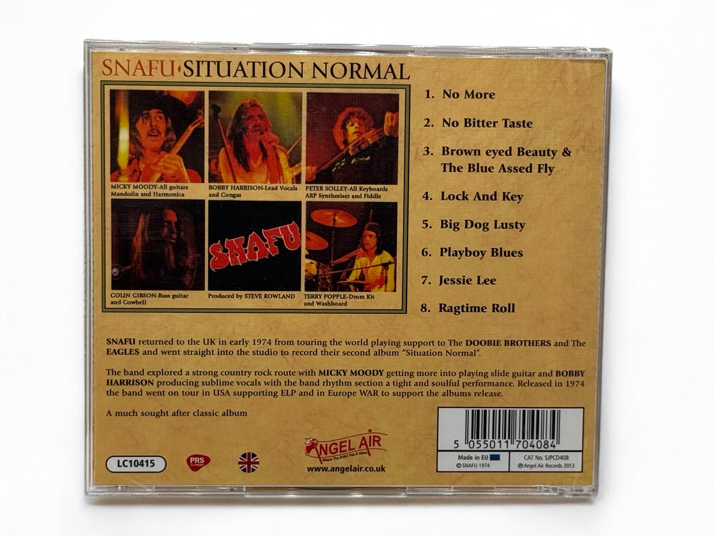 Originally released in 1974, Situation Normal was Snafu’s second album, recorded shortly after their return from touring with The Doobie Brothers and The Eagles. This reissue by Angel Air (catalogue SJPCD408) revives the band’s gritty blues-rock sound, spotlighting: